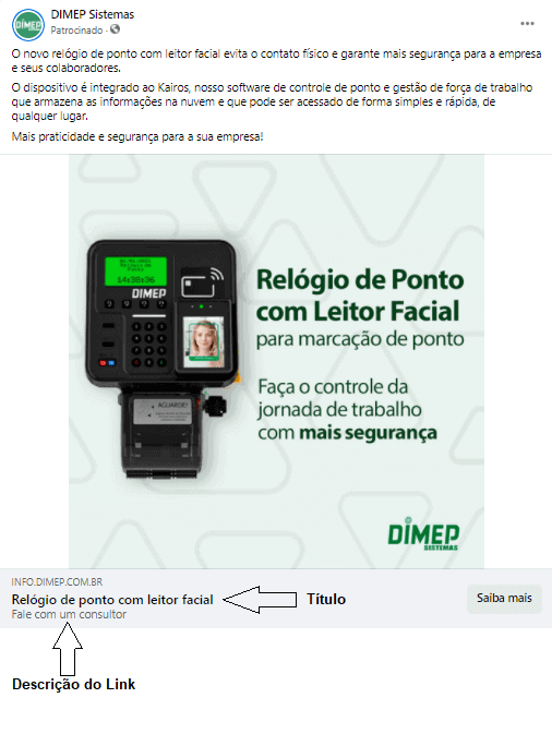 Veja o exemplo abaixo em que o título (até 40 caracteres) é a frase Relógio de Ponto com Leitor Facial e a descrição (até 30 caracteres) é Fale com um consultor.