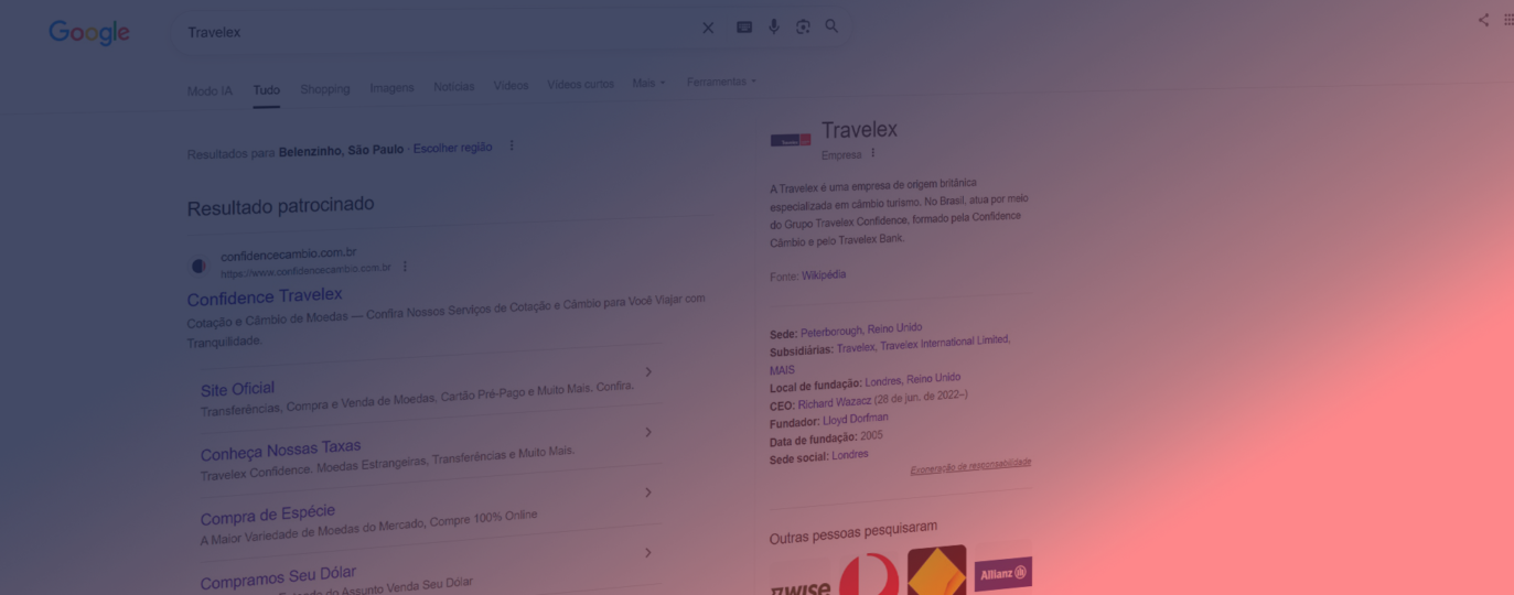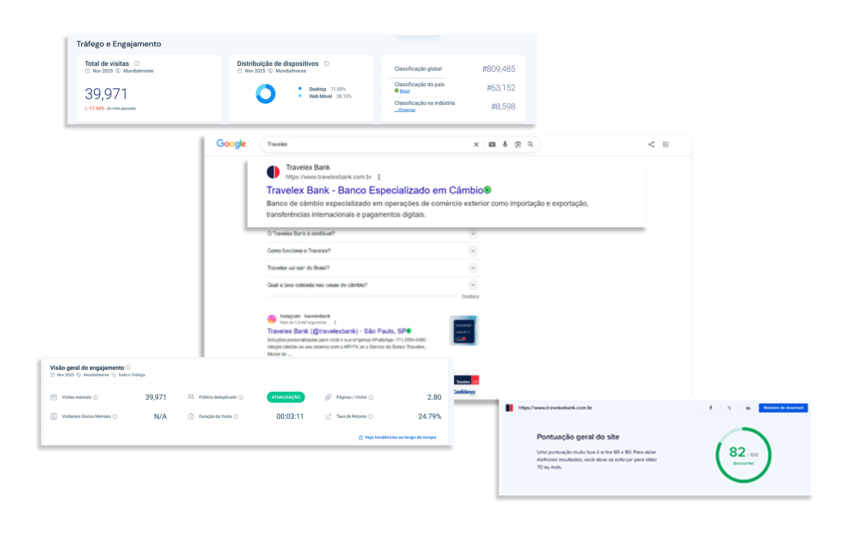 Em 1 ano de projeto, o site Travelex Bank subiu 13 pontos na média de pesquisa do Google e passou da terceira página na SERP para a primeira, saindo da 21ª posição para a . Já o site Travelex Confidence avançou da 11ª posição para a 9ª, também entrando na primeira página de pesquisa. Além disso, ambos sites se tornaram referência para busca em IA a partir de estratégias integradas de SEO e GEO.